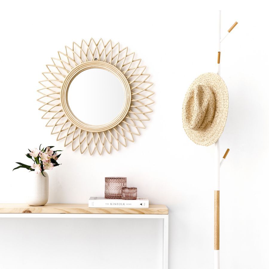 Este espejo de mimbre combinado con azul marino quedará ideal en cualquier recibidor nórdico. Combinado con tonos blanco para conseguir el efecto nórdico.